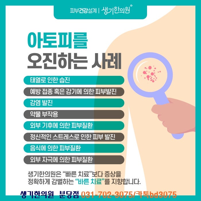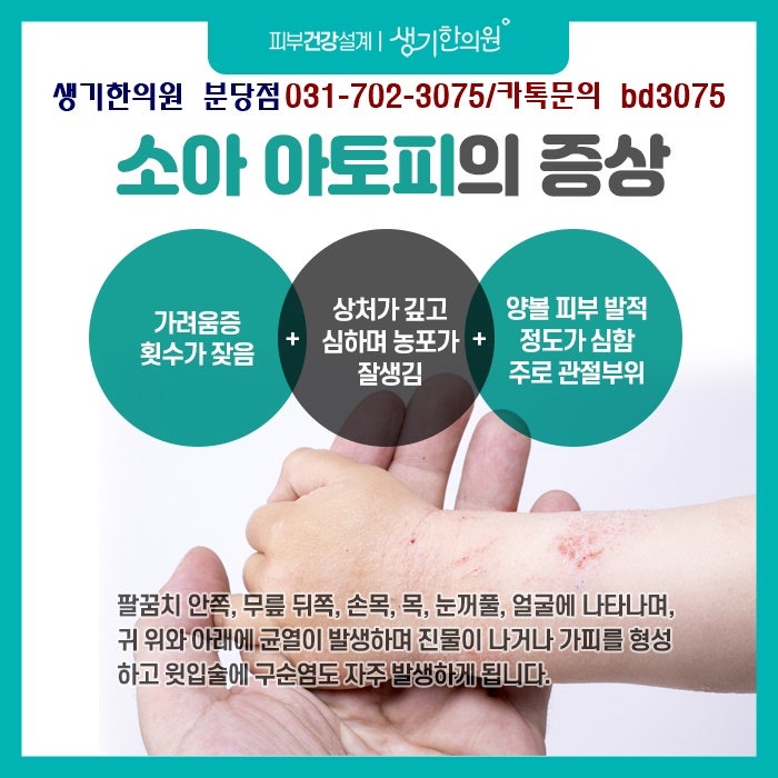 소아 아토피 치료는 다른 질환과 달리 환자의 연령에 따라 증상, 발병 부위, 증상 등에서 차이를 보인다. 처음에는 영향을 받은 부위가 축축하고 게처럼 붉으며 극도로 가렵습니다. 그러나 성인이 된 후에는 목과 같은 피부 주름이 지속적인 자극으로 인해 표피가 두꺼워지고 색소 침착되는 등의 태선화 현상을 보이는 경우가 많다. 또한 어린 시절에 시작하는 사람의 약 40%는 성인이 되어서도 계속 성장할 수 있기 때문에 면역력 향상과 건강 유지를 위해 한방으로 관리하는 것이 가장 좋습니다.