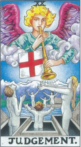 카드의 이미지는 중앙 천사가 나팔을 부는 동안 죽은 자들이 땅에서 일어나 새로운 삶을 시작하는 모습을 보여줍니다. 이것은 타로 카드의 심판 카드가 환생, 중생 및 새로운 시작을 상징한다는 것을 보여줍니다. 죽은 자의 부활은 또한 변화, 결단, 자각에 대한 의미를 갖는다. 새로운 시작과 희망을 상징하는 카드의 배경에는 태양이 떠오르며 빛의 상징적 의미를 담고 있습니다.