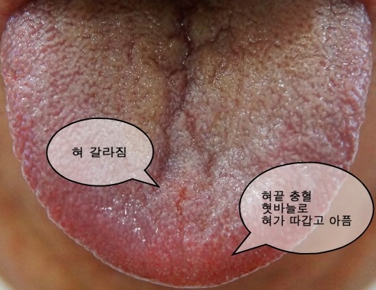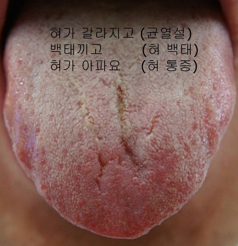 “선생님~ 혀에 하얀 가루가 많이 묻어 있는데 노랗게 변한 부분이 보이고 입냄새가 심해요. 입이 계속 답답하고 건조해서 혀가 입 전체를 따끔거립니다. , 하지만 특히 내 혀끝.”